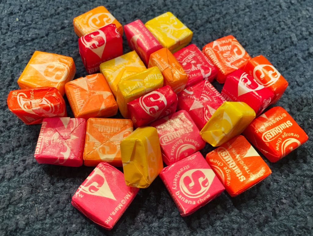 - Starburst: Or Opal Fruits, depending on your age, these little fruity treats are a mixed bag, pardon the pun, based on what time of year you are travelling. If it is warm then they will be chewy, if it is cold outside then be prepared to nearly break your teeth before enjoying whichever flavour is your favourite.